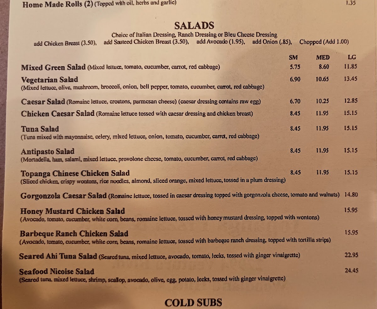 The menu features standout offerings such as the Topanga Vegetarian Special and Falling Rock pizza, both bursting with fresh ingredients and rich flavor profiles. For sub lovers, the Monster Sub and Chicken Parmigiana Sub are crowd favorites, delivering hearty portions and comforting tastes.